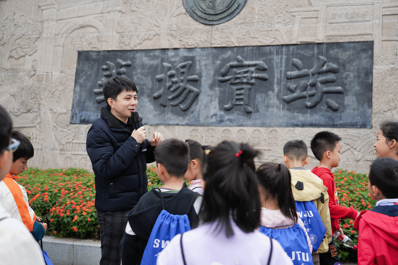 随后,“运小苗”分为红蓝两队,有序开启“科普列车”第一站——参观竢实扬华浮雕墙。在陶思宇老师生动的讲述中,孩子们了解了学校从建校至今的奋斗历程,感悟“竢实扬华”精神背后的家国情怀与铁路情结。