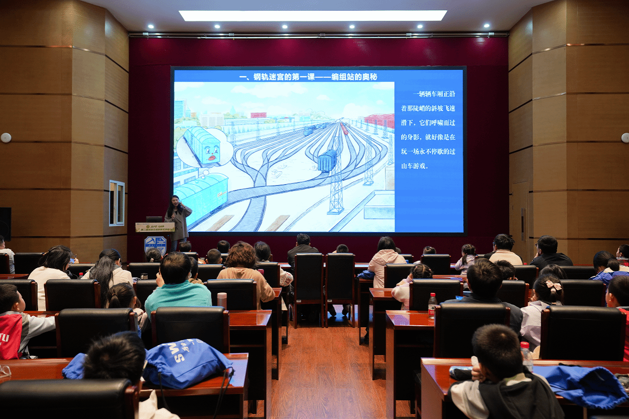 上午11时10分,交通运输与物流四川省科普基地、交通运输与物流学院实验中心史磊老师以《小货的奇妙旅程——铁路编组站知识科普》为题,带来一场别开生面的科普讲座。通过中欧班列货运棚车“小货”的视角,孩子们在故事中理解了编组站的运作原理,现场互动热烈,掌声不断。