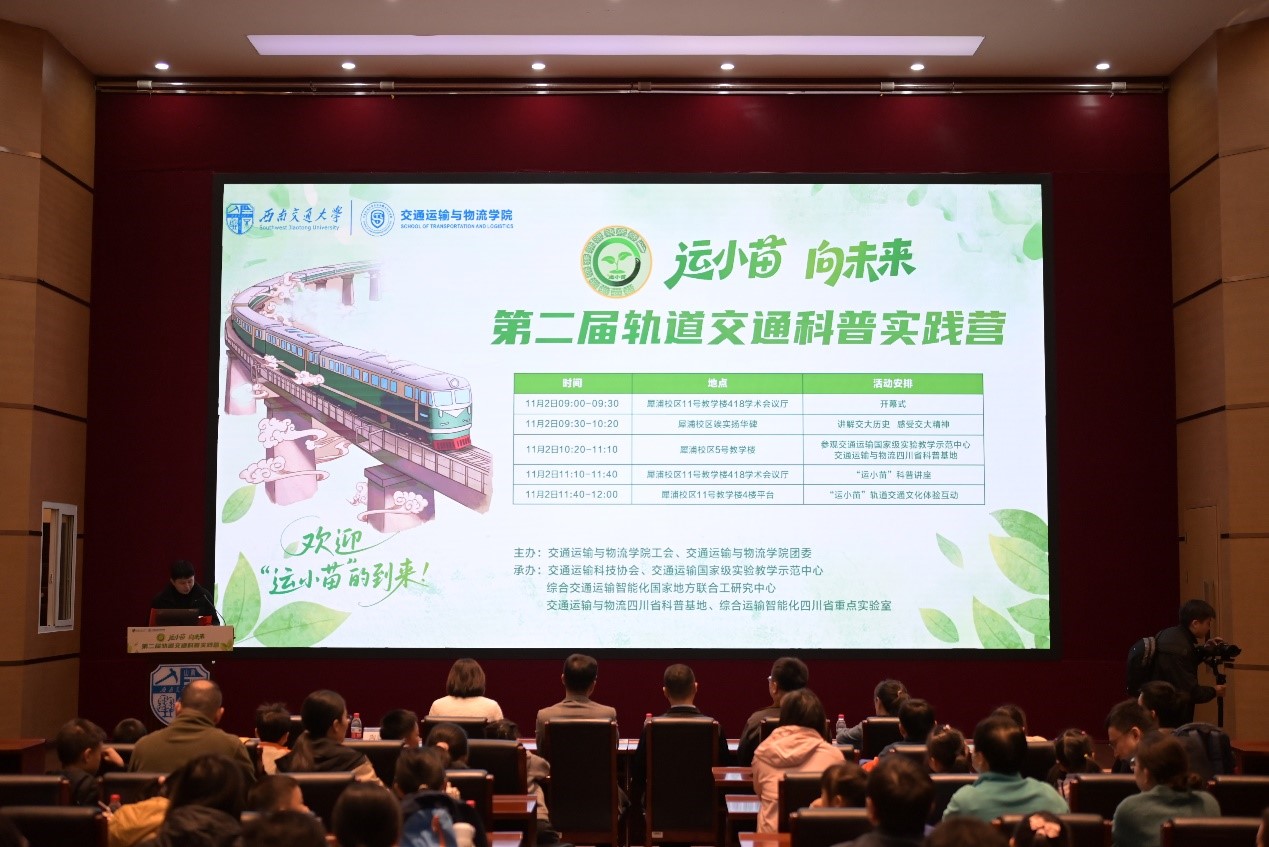 2025年11月2日上午,西南交通大学犀浦校区迎来了一批特殊的“小乘客”——第二届“运小苗,向未来”轨道交通科普实践营活动在此温馨开幕。本次活动由交通运输与物流学院工会、交通运输与物流学院团委主办,交通运输科技协会、交通运输国家级实验教学示范中心、综合交通运输智能化国家地方联合工程研究中心、交通运输与物流四川省科普基地、综合运输智能化四川省重点实验室承办,面向教职工及校友院友家庭,为4至15岁的“运小苗”打造了一场融合历史、科技与趣味的轨道交通探索之旅。