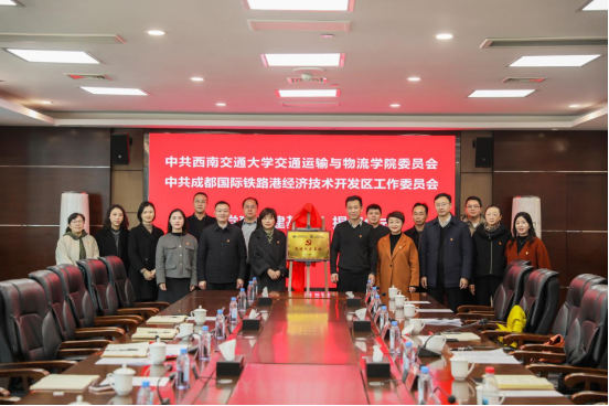 2025年12月1日,学校党委组织部、党委宣传部和交通运输与物流学院党委前往成都国际铁路港经济技术开发区,在青白江区党委组织部副部长邱爽和学校党委组织部副部长何诣寒、党委宣传部副部长郑波的指导与见证下,交通运输与物流学院党委书记张光远和成都国际铁路港经济技术开发区党工委书记戚玉静共同为“党建共建基地”揭牌,双方正式启动共建“中共西南交通大学交通运输与物流学院委员会——中共成都国际铁路港经济技术开发区工作委员会‘党建共建基地’”。