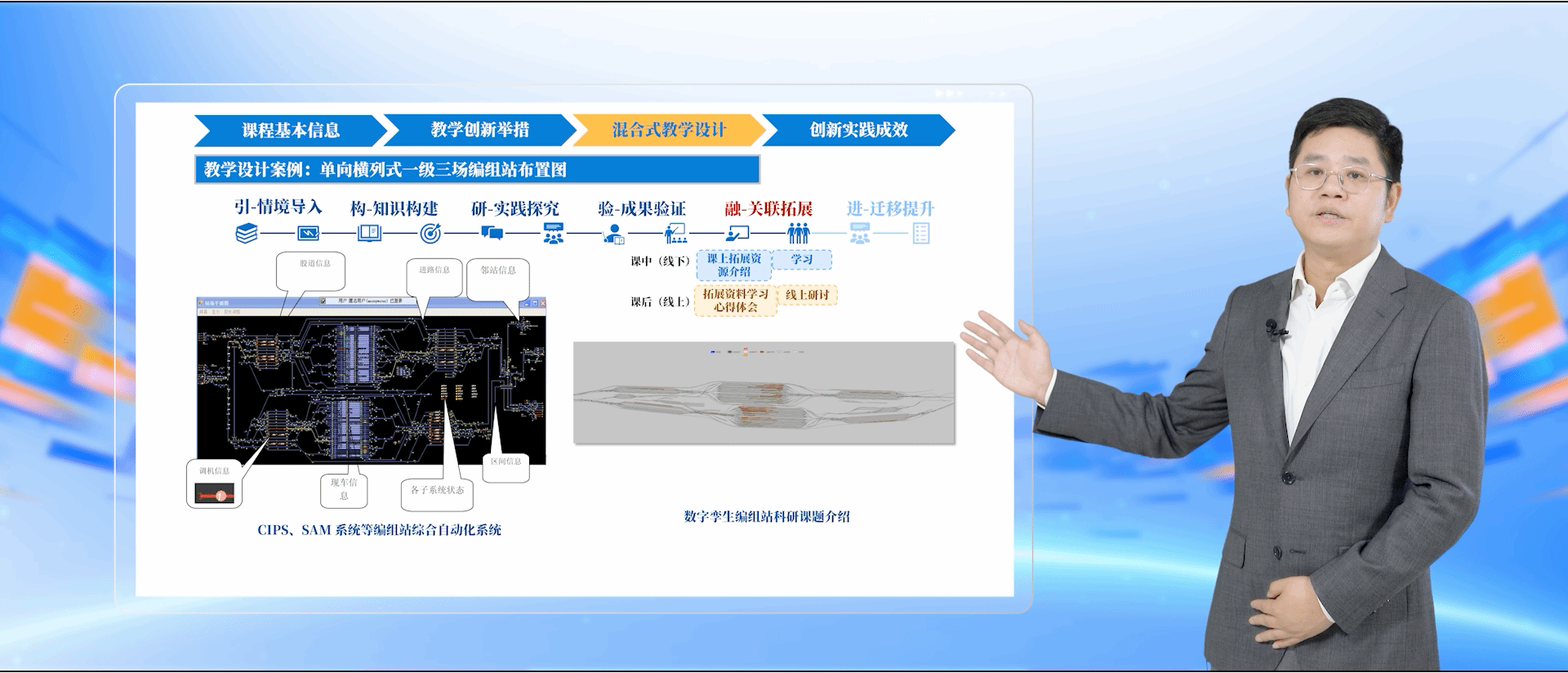 本届大赛于6月启动,我校遴选出在混合式教学实践中拥有扎实基础的四门课程教学团队参赛。经过多轮磨课和精心准备,我院何必胜老师及其团队的课程“铁路车站及枢纽”入围现场决赛环节。12月6日,在77所高校82门课程的同场竞技中,该课程凭借优质的创新设计和育人成果,终获一等奖和“产教融合”专项奖。