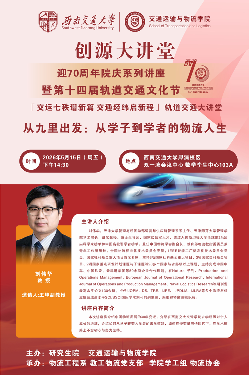 本次讲座将介绍中国物流发展的30年变迁,介绍在西南交大交运学院求学经历对个人成长的历练,介绍如何从学子转变为学者的求学道路,如何在慢变量与快时代下,在学术道路上不忘初心与努力坚持。